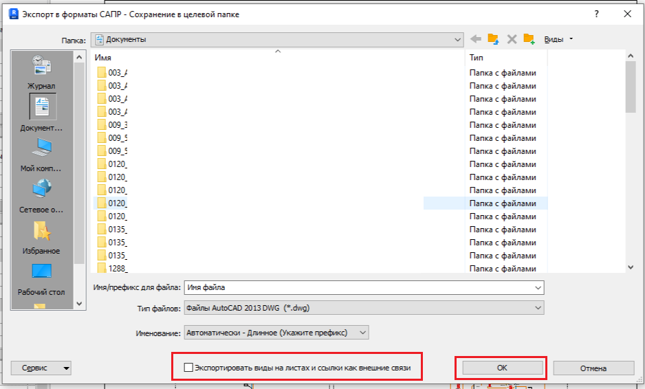 6. Выбираем путь для сохранения файла. Убеждаемся, что снята галочка напротив «Экспортировать виды на листах и ссылки как внешние связи»